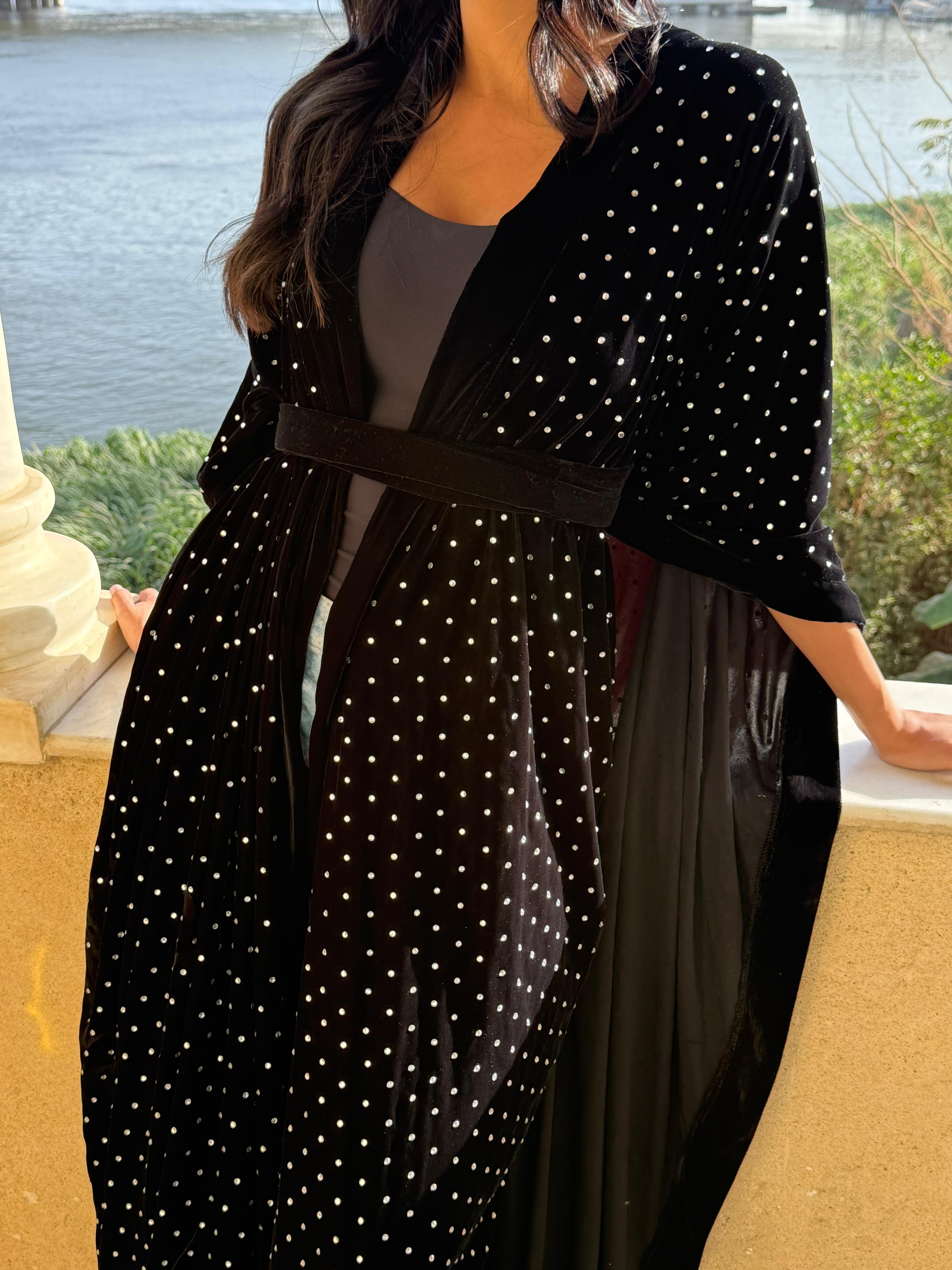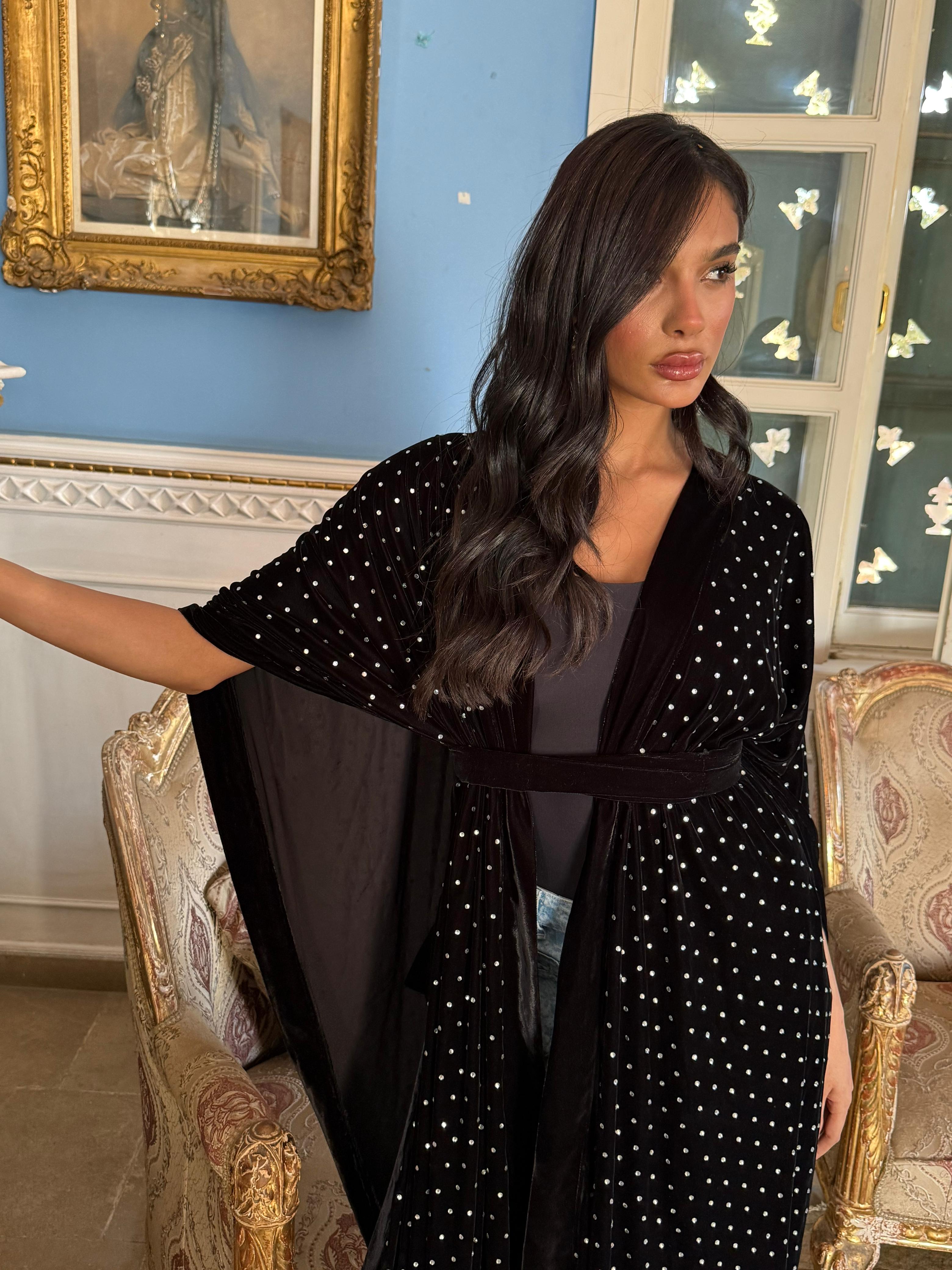 Black velvet adorned with delicate Swarovski stones on top, designed to softly drape and subtly reveal your under outfit.