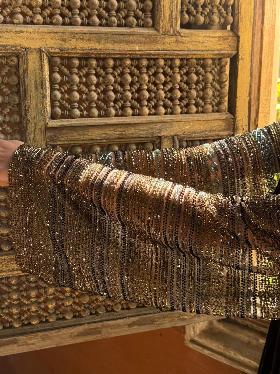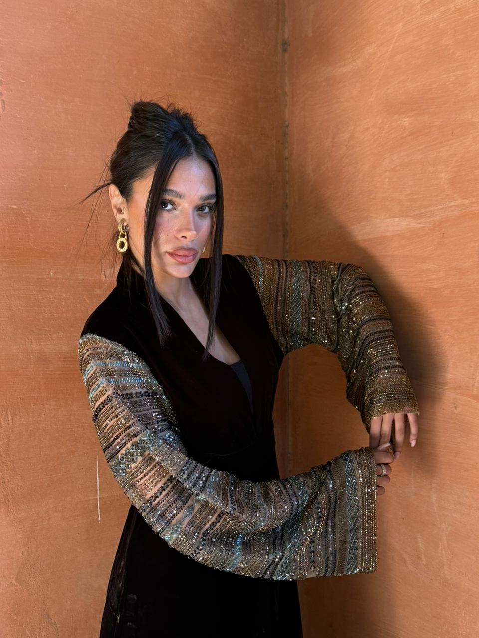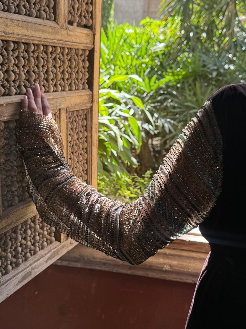 Deep brown velvet elevated with handcrafted stone embellishments for a bold yet elegant statement.