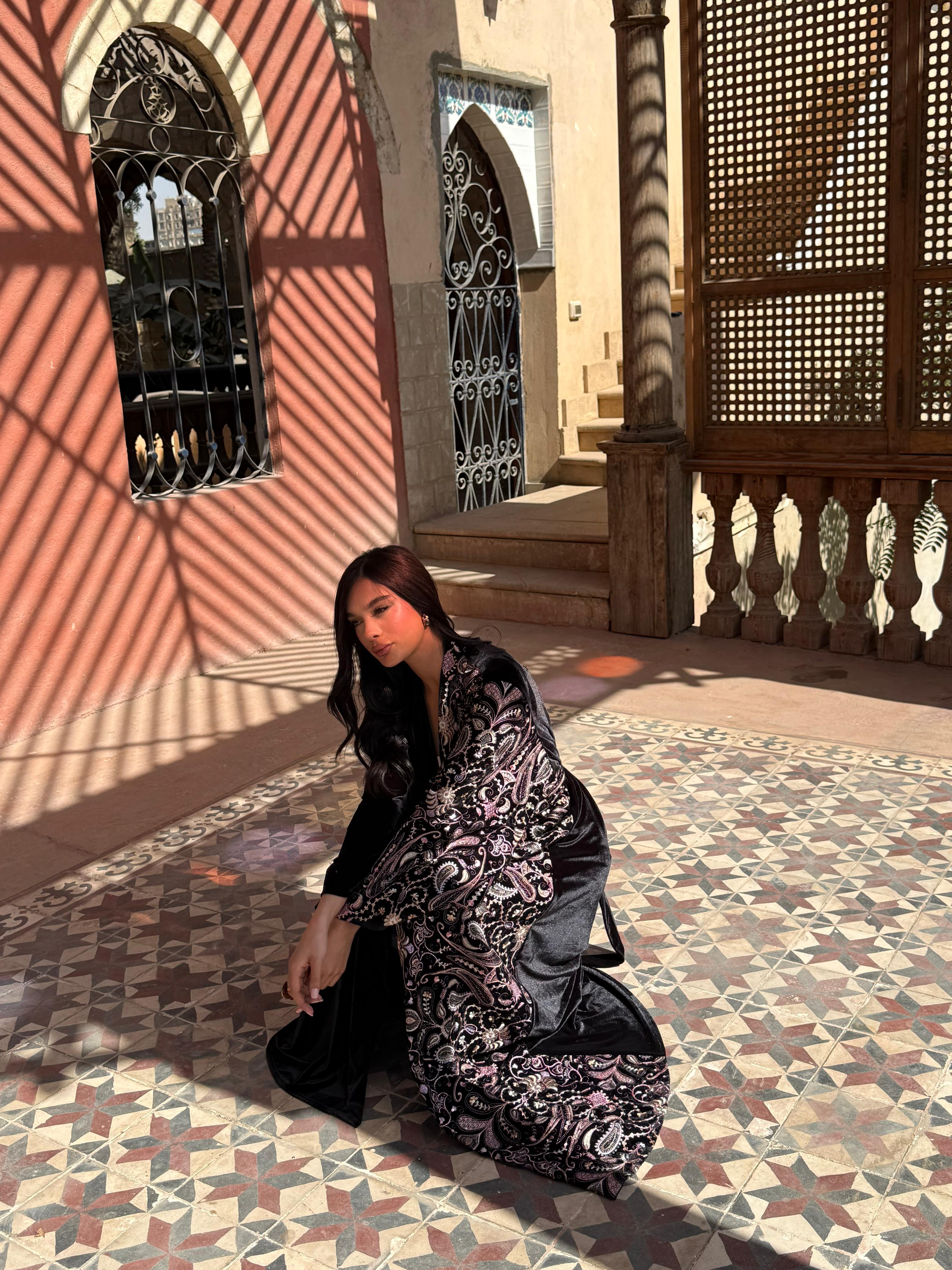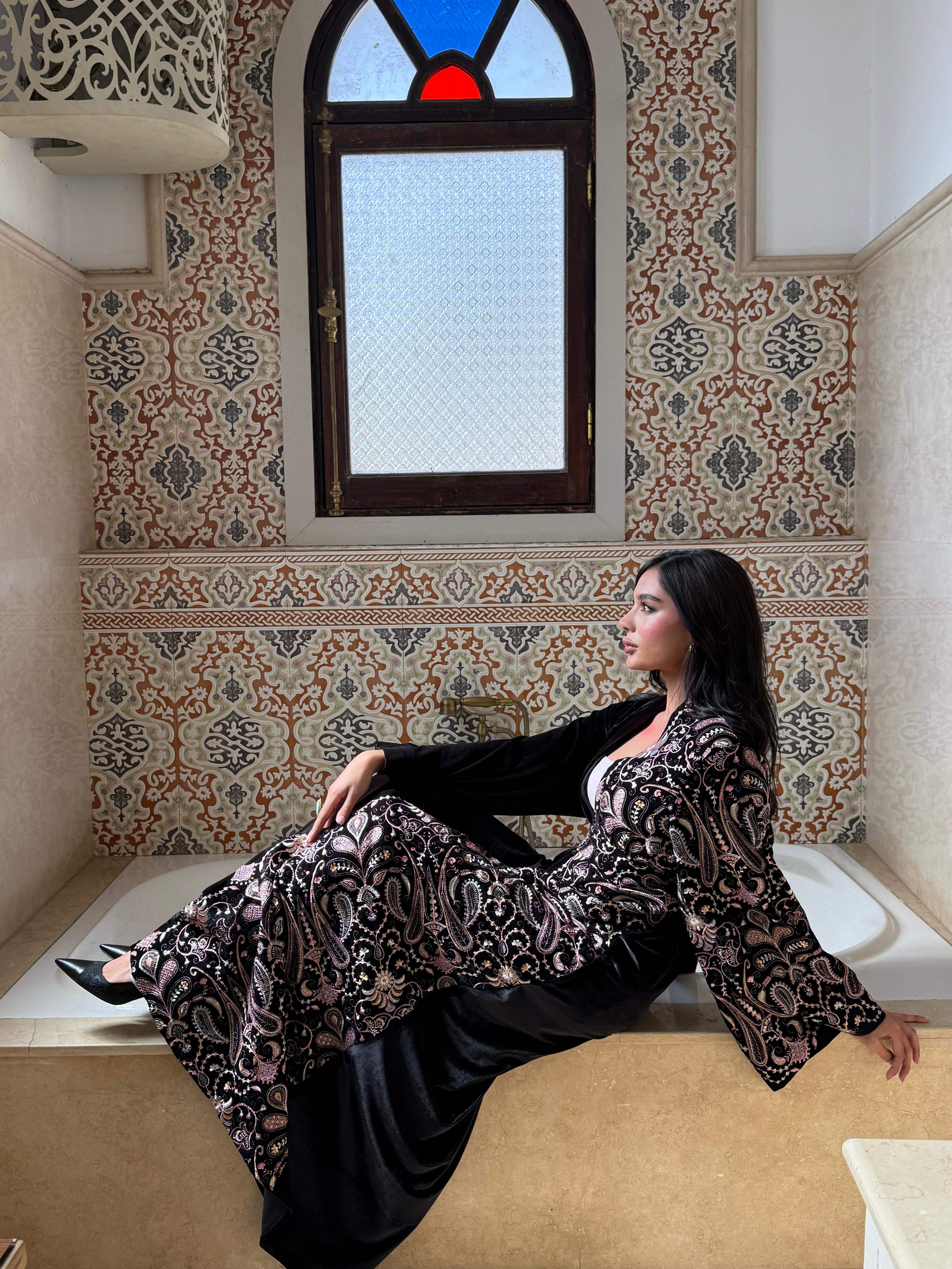 Black velvet in a half-and-half design, sprinkled with embroidered Indian fabric hearts — sweet, bold, and made to steal hearts.