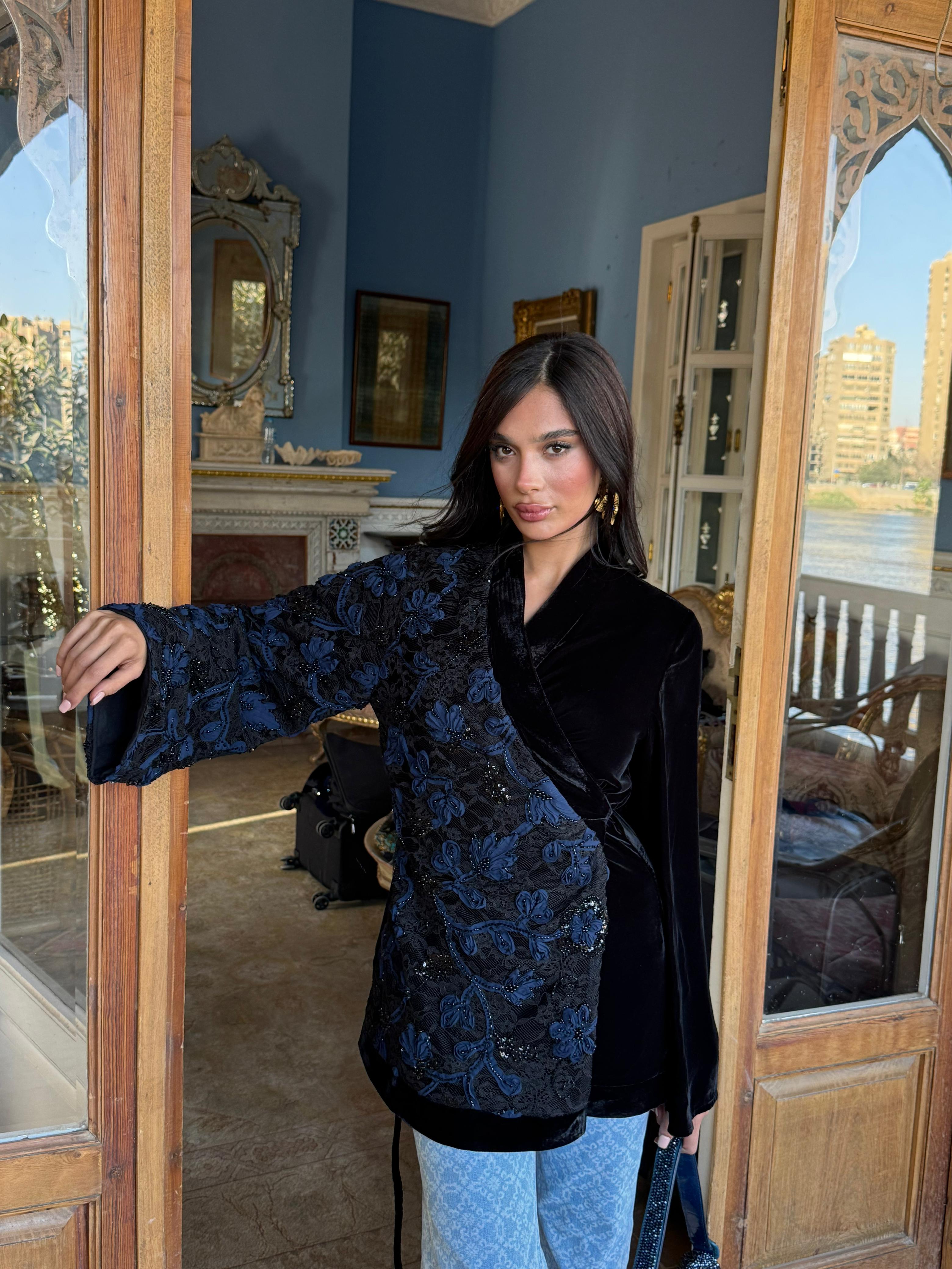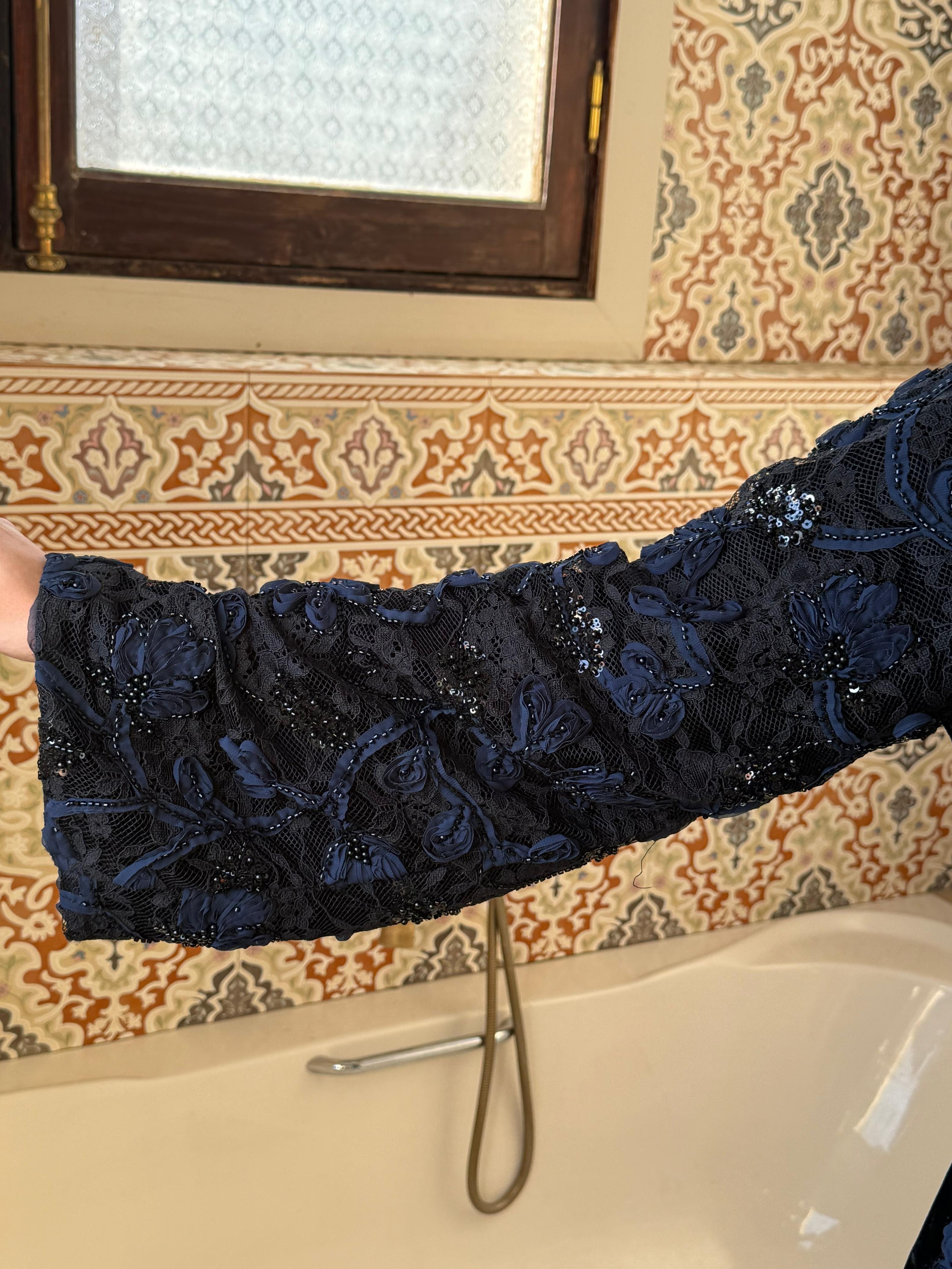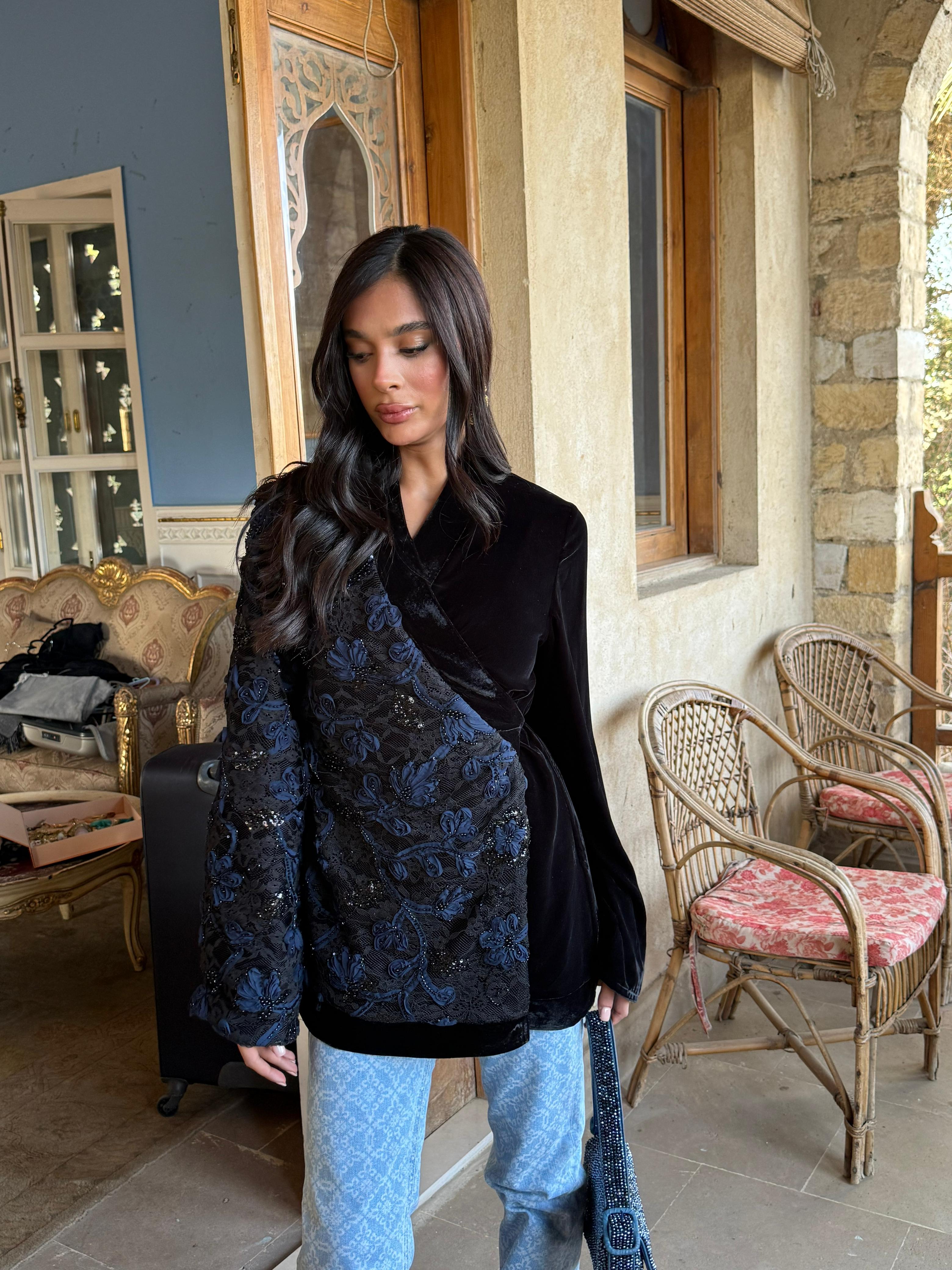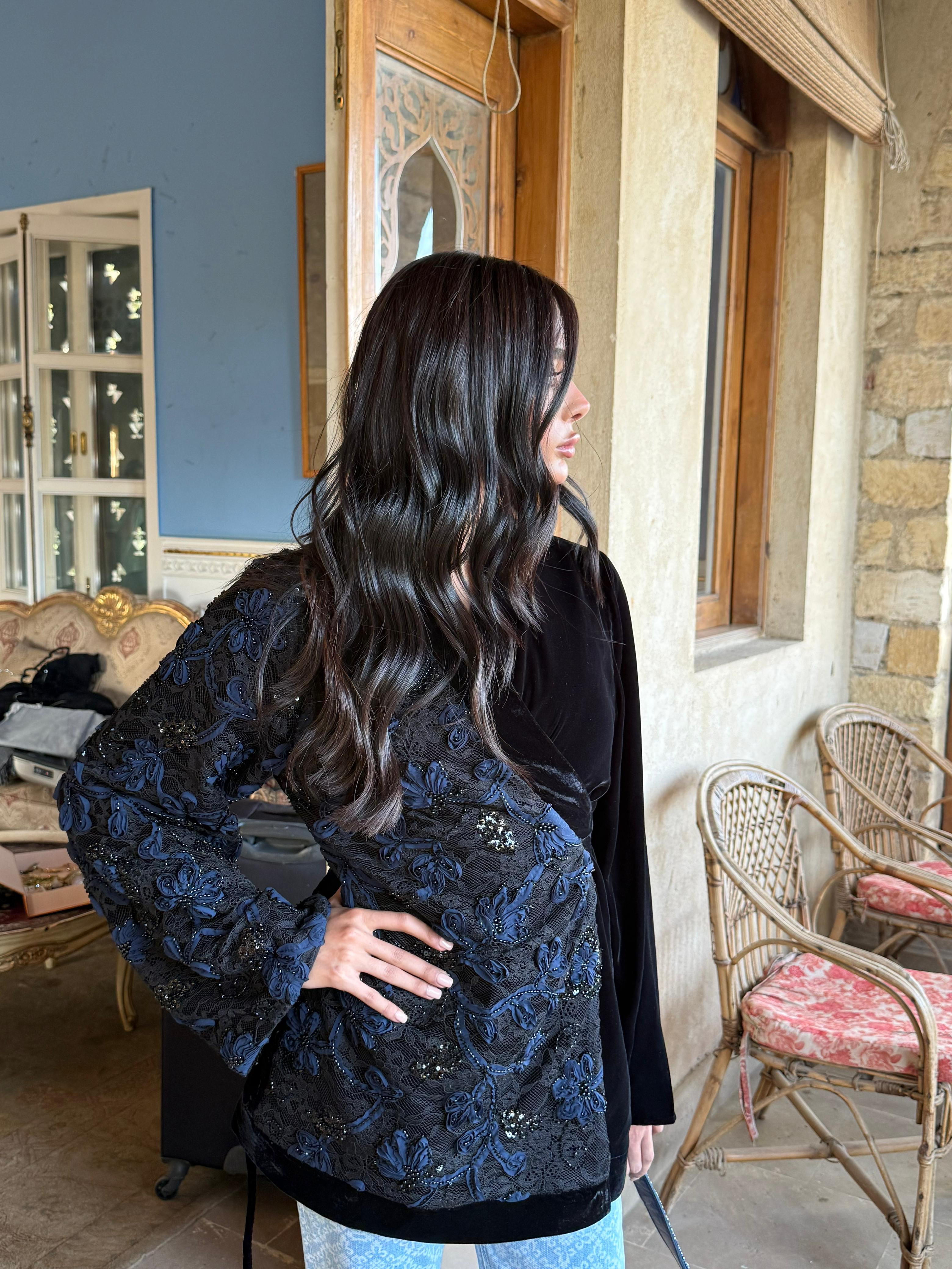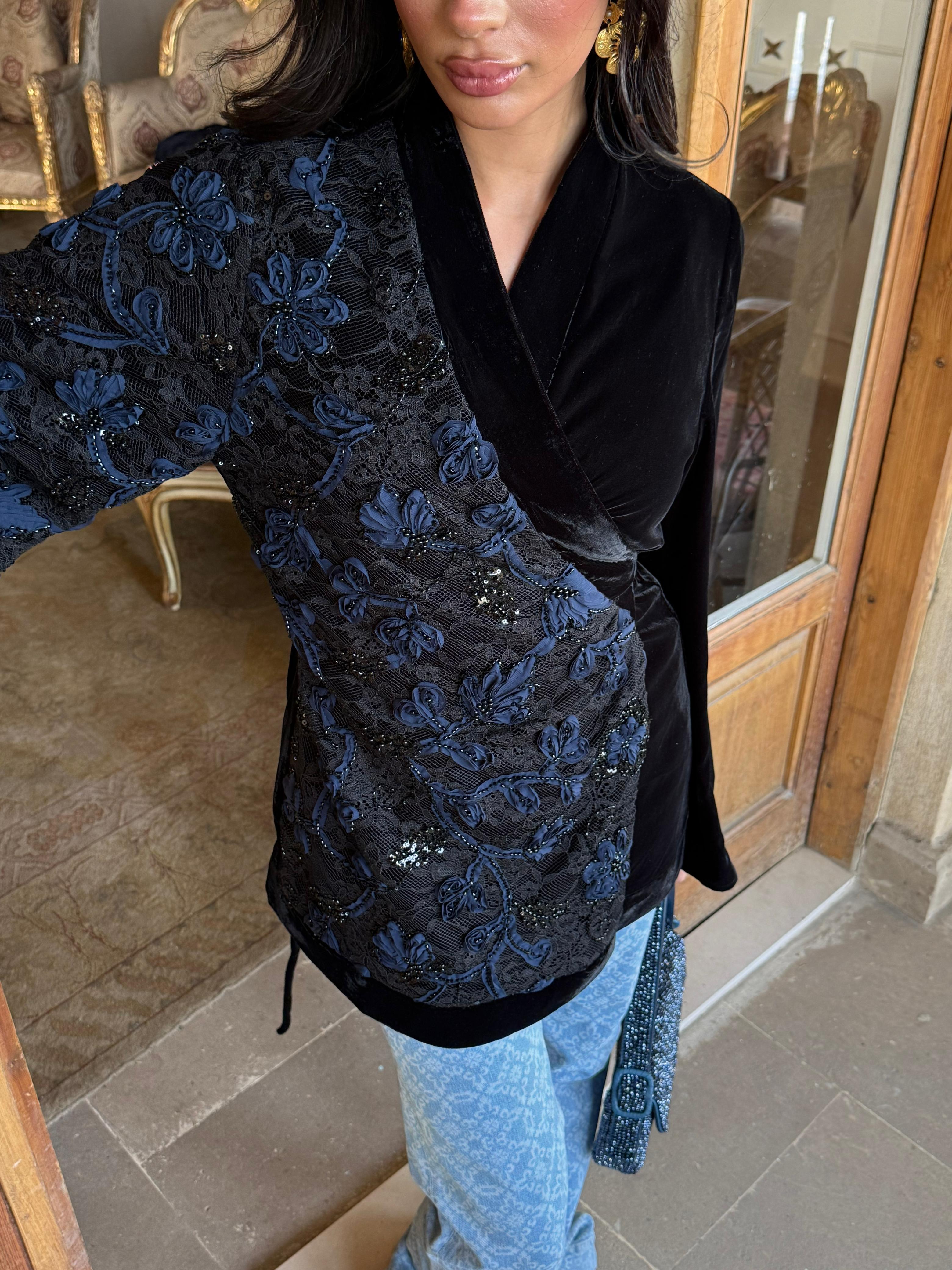 A striking contrast of textures — delicate tulle flowers layered over intricately beaded lace on one side, with rich plain velvet on the other.