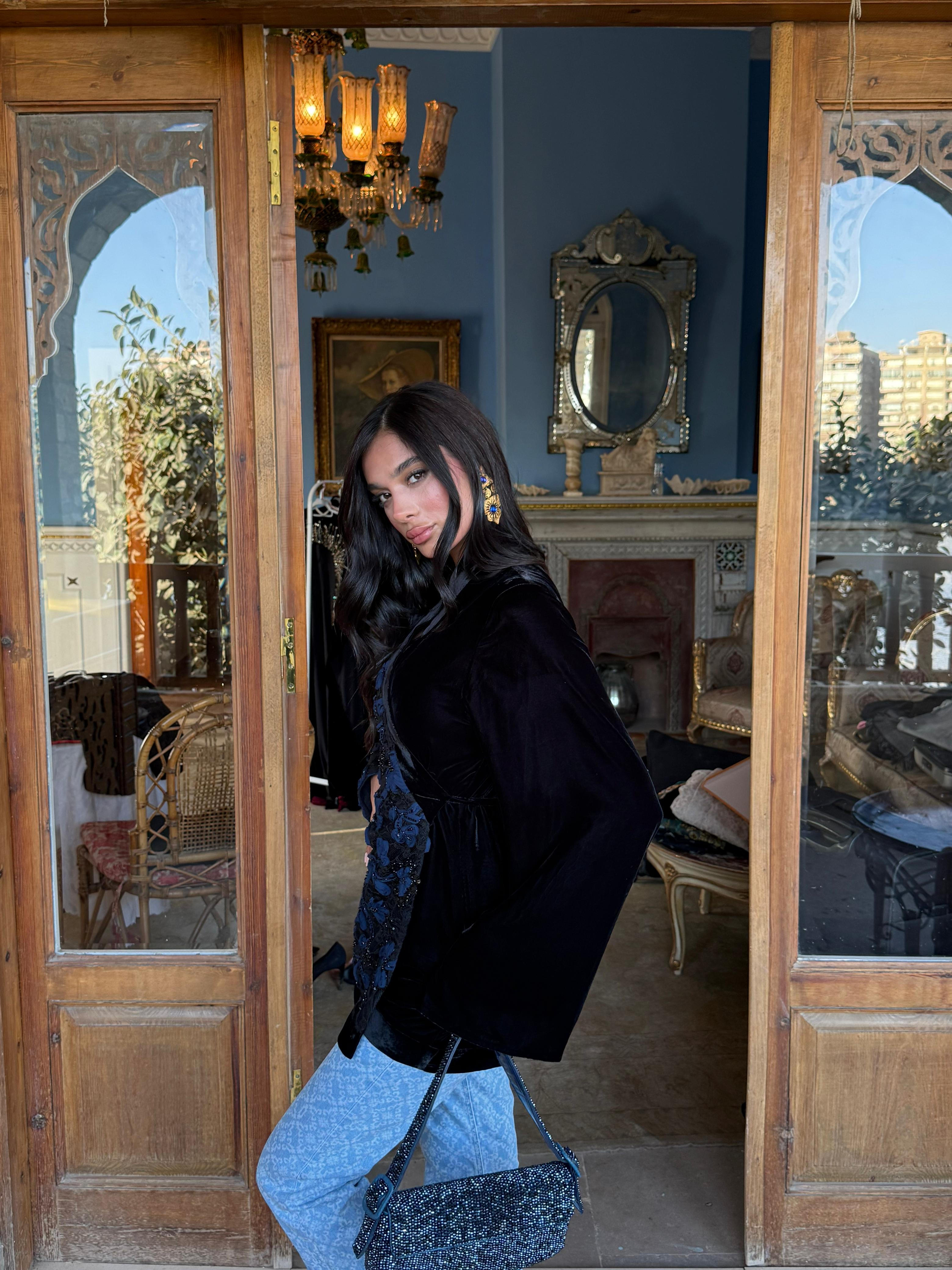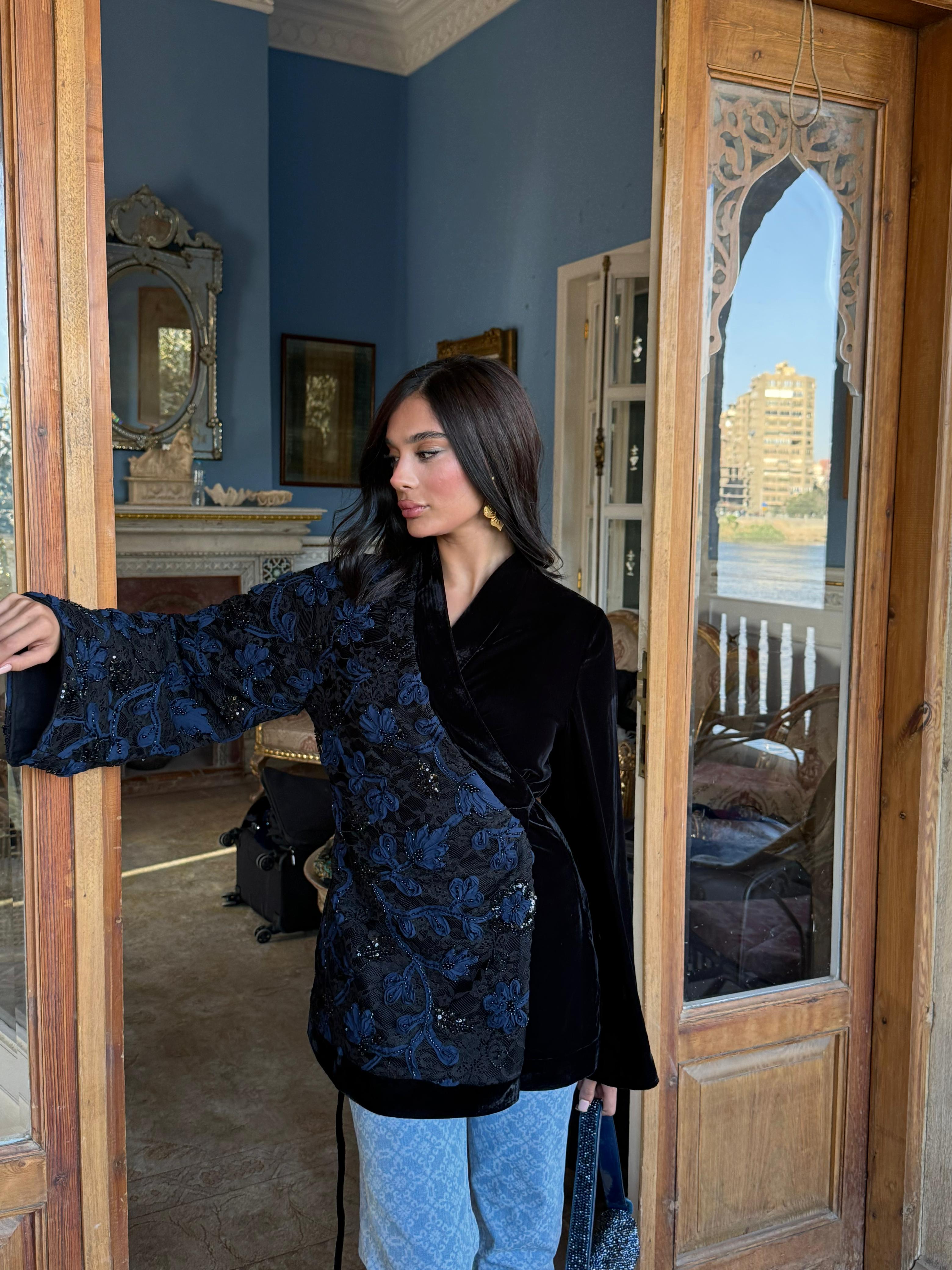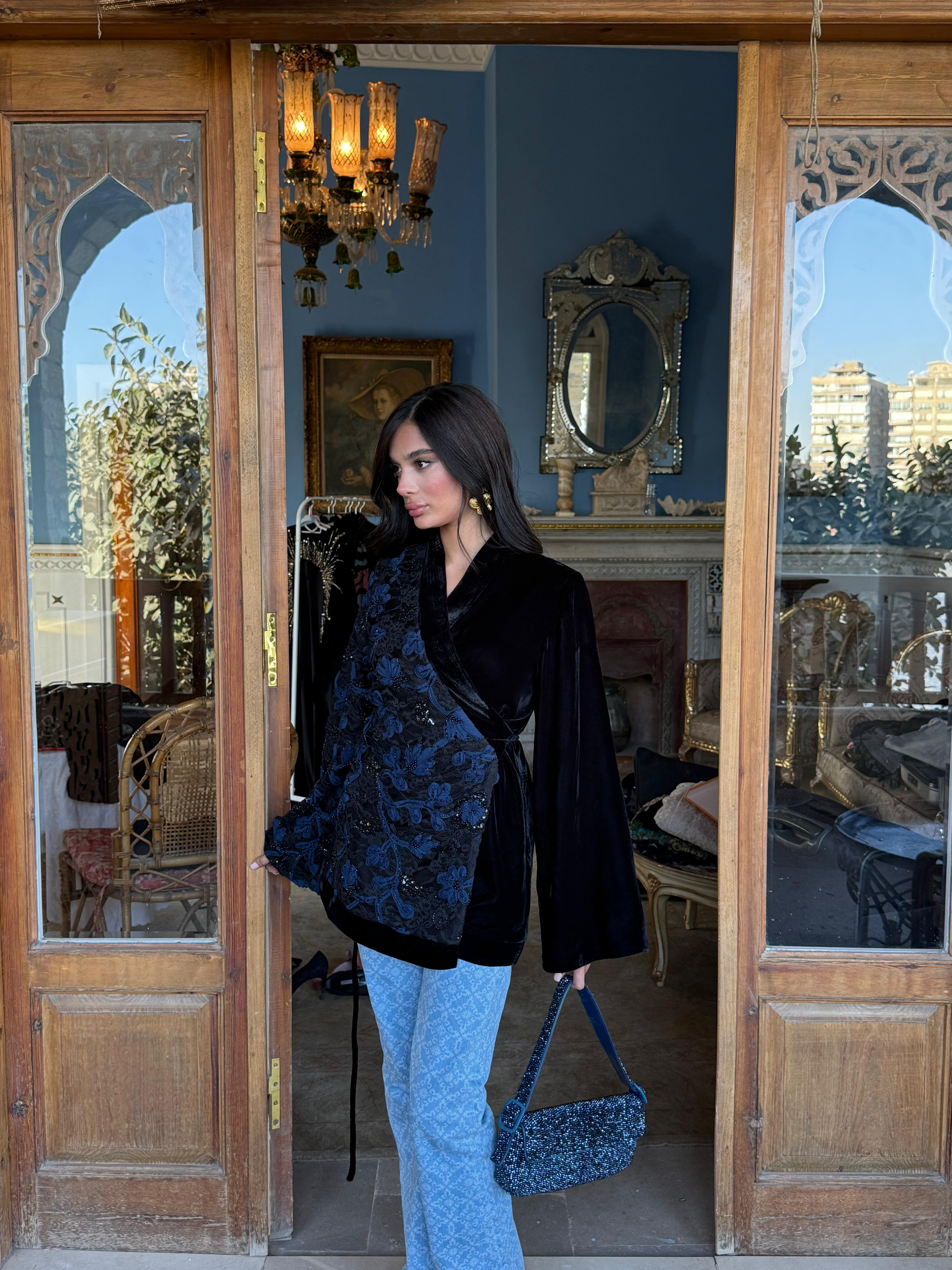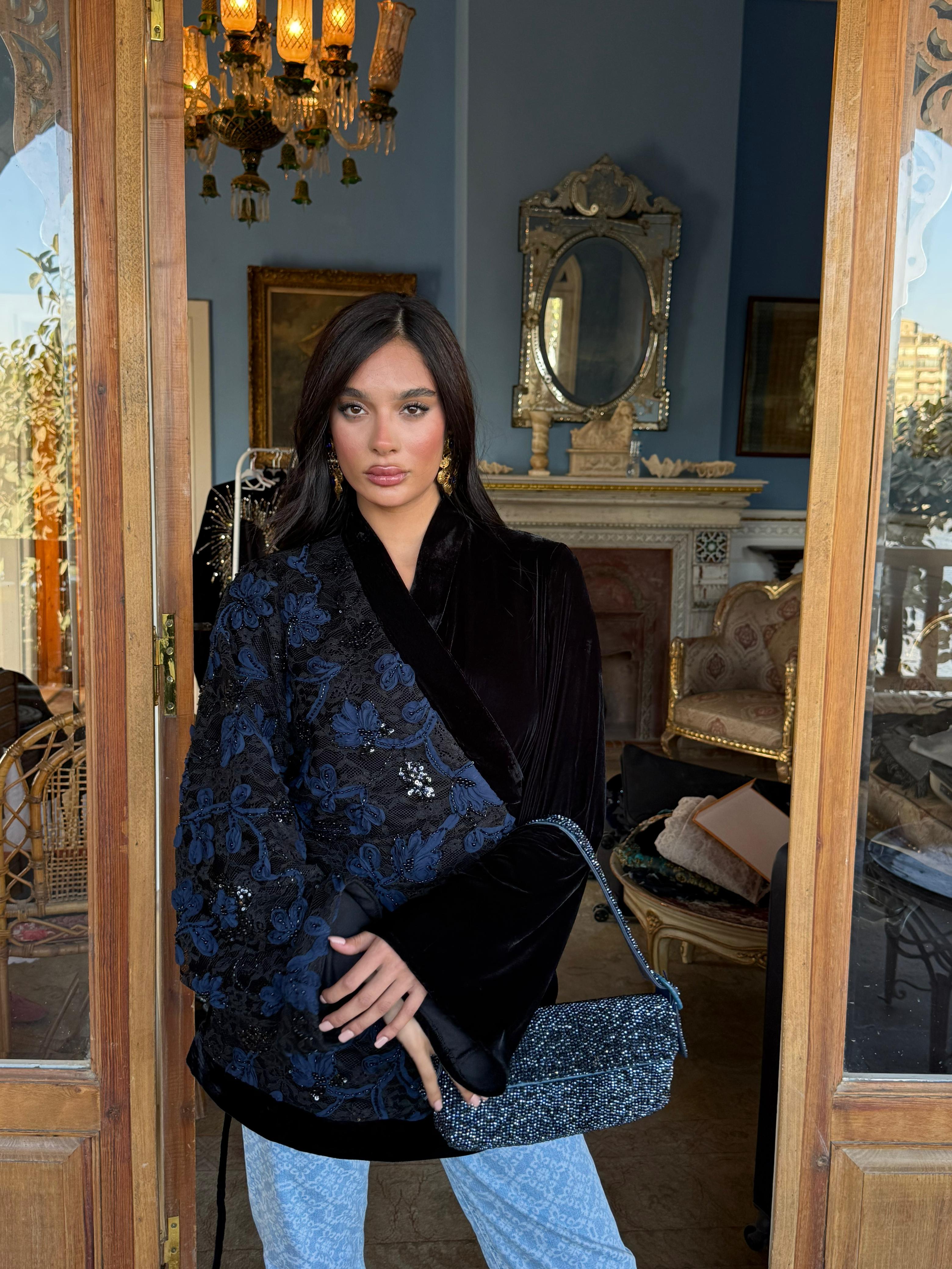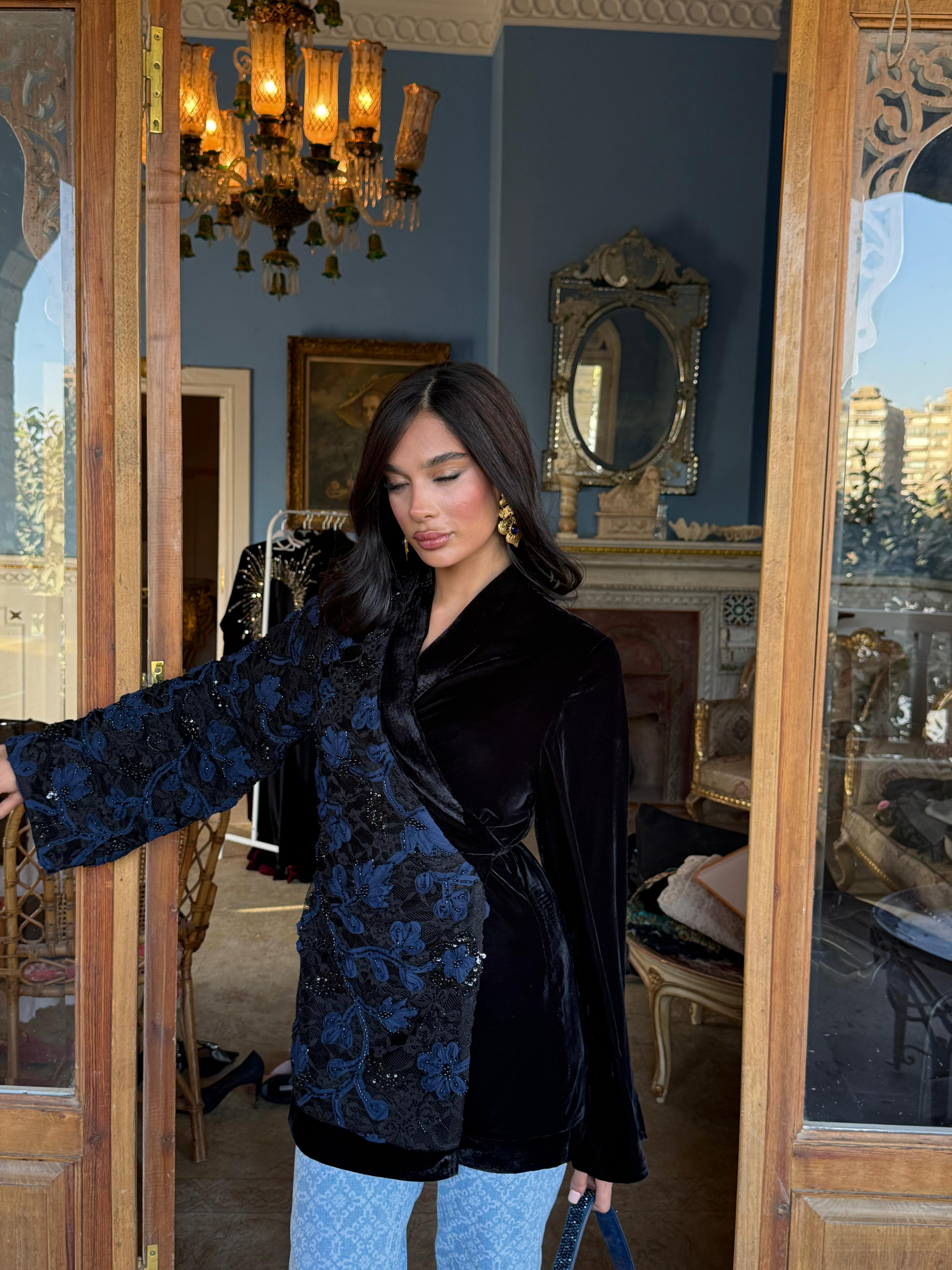 A striking contrast of textures — delicate tulle flowers layered over intricately beaded lace on one side, with rich plain velvet on the other.