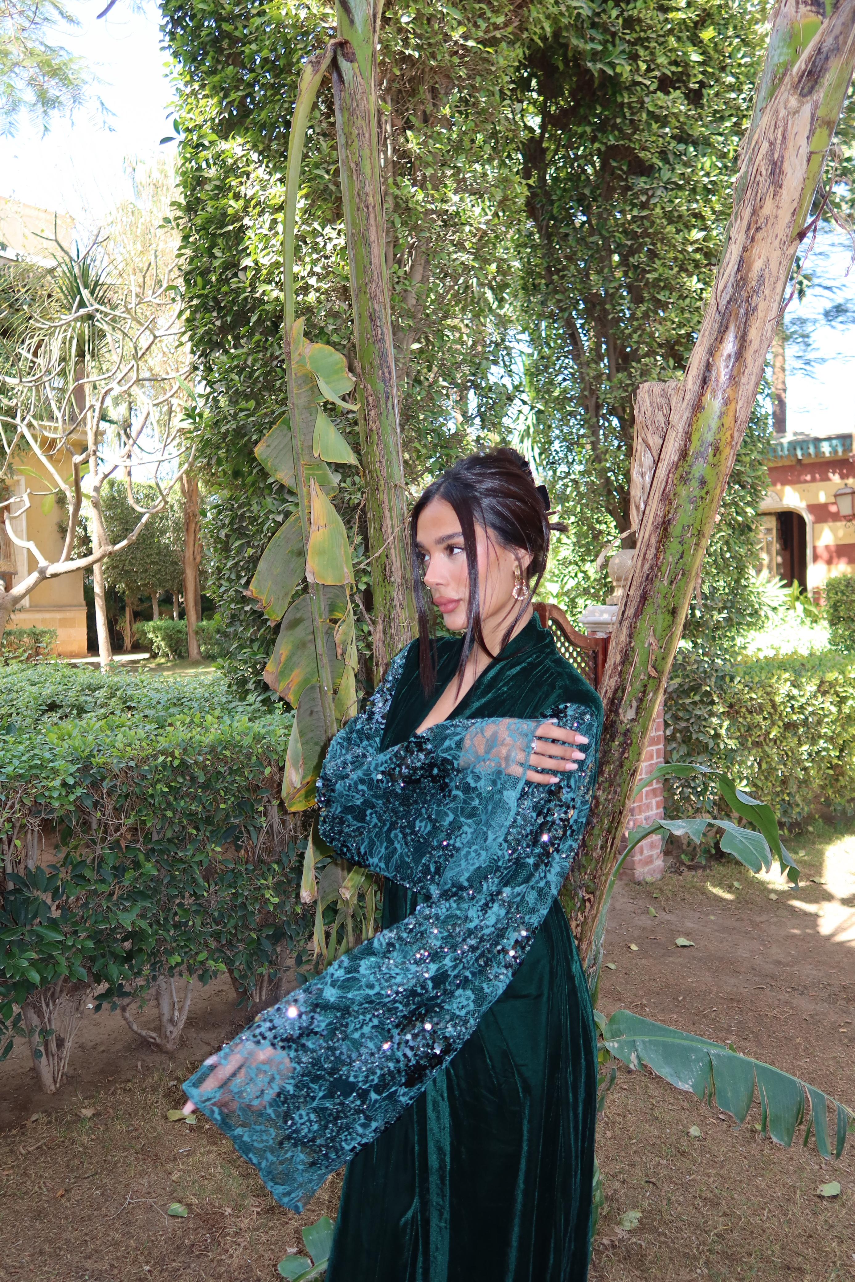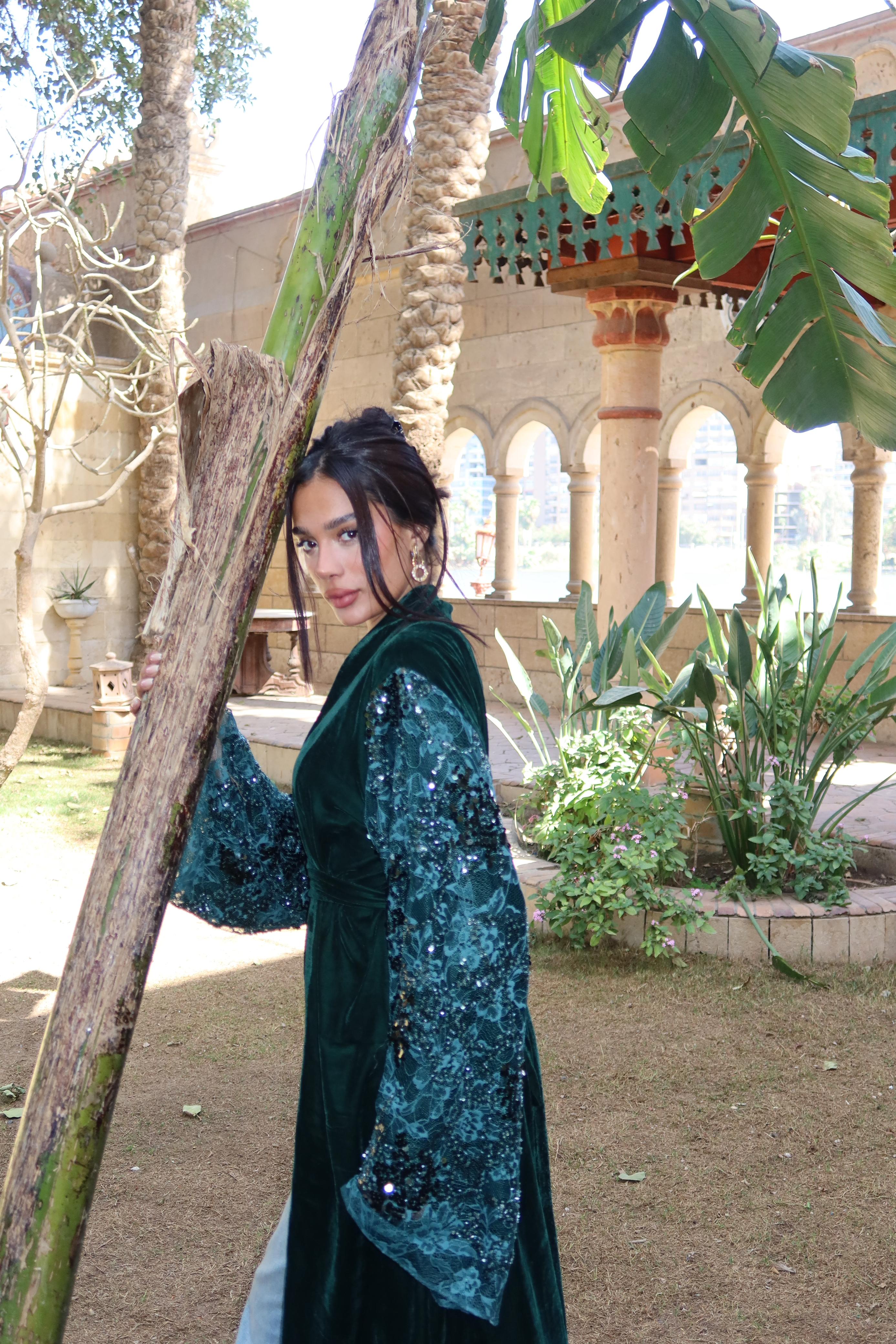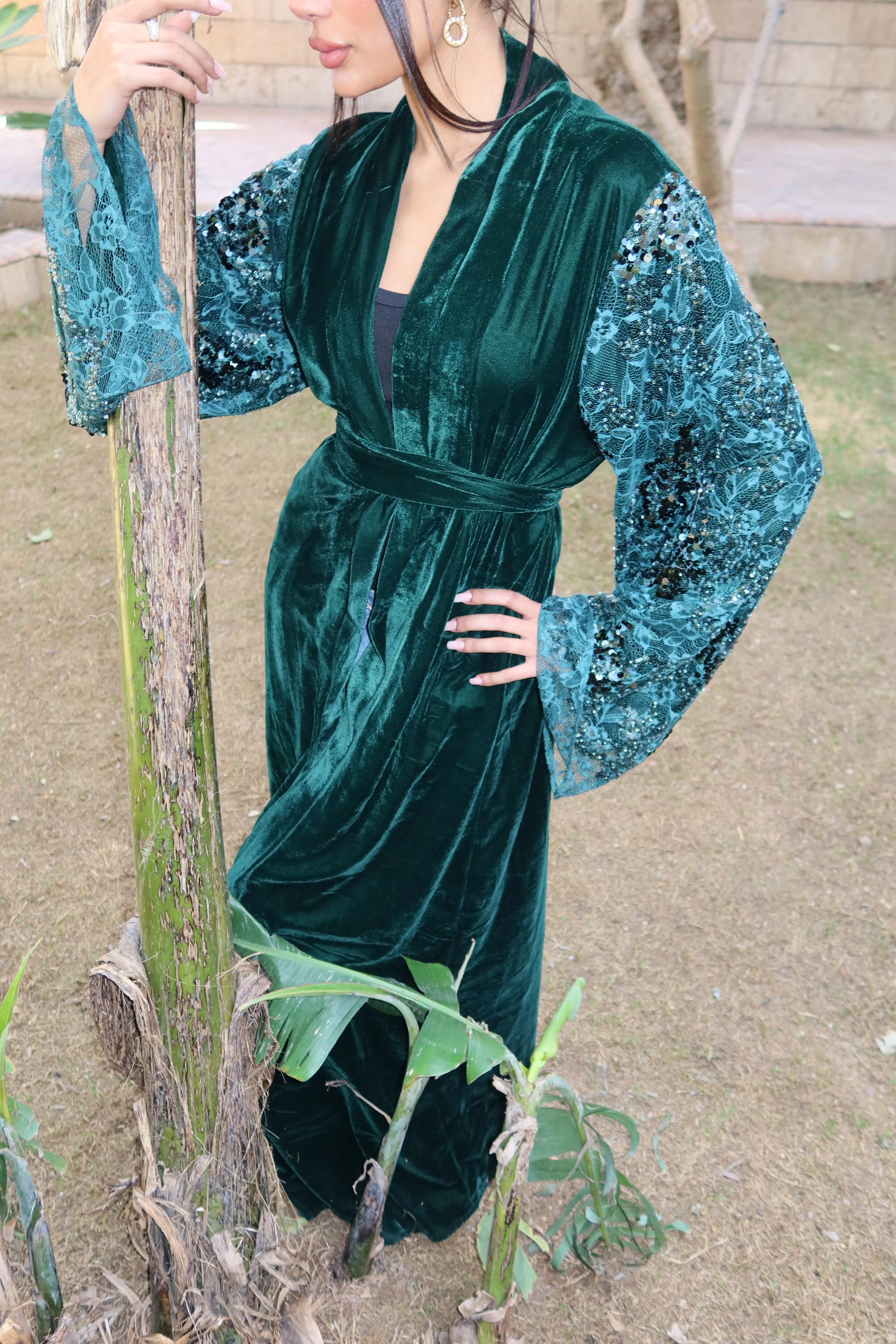 Emerald velvet kaftan paired with sequined lace sleeves, blending rich texture with delicate shimmer.
