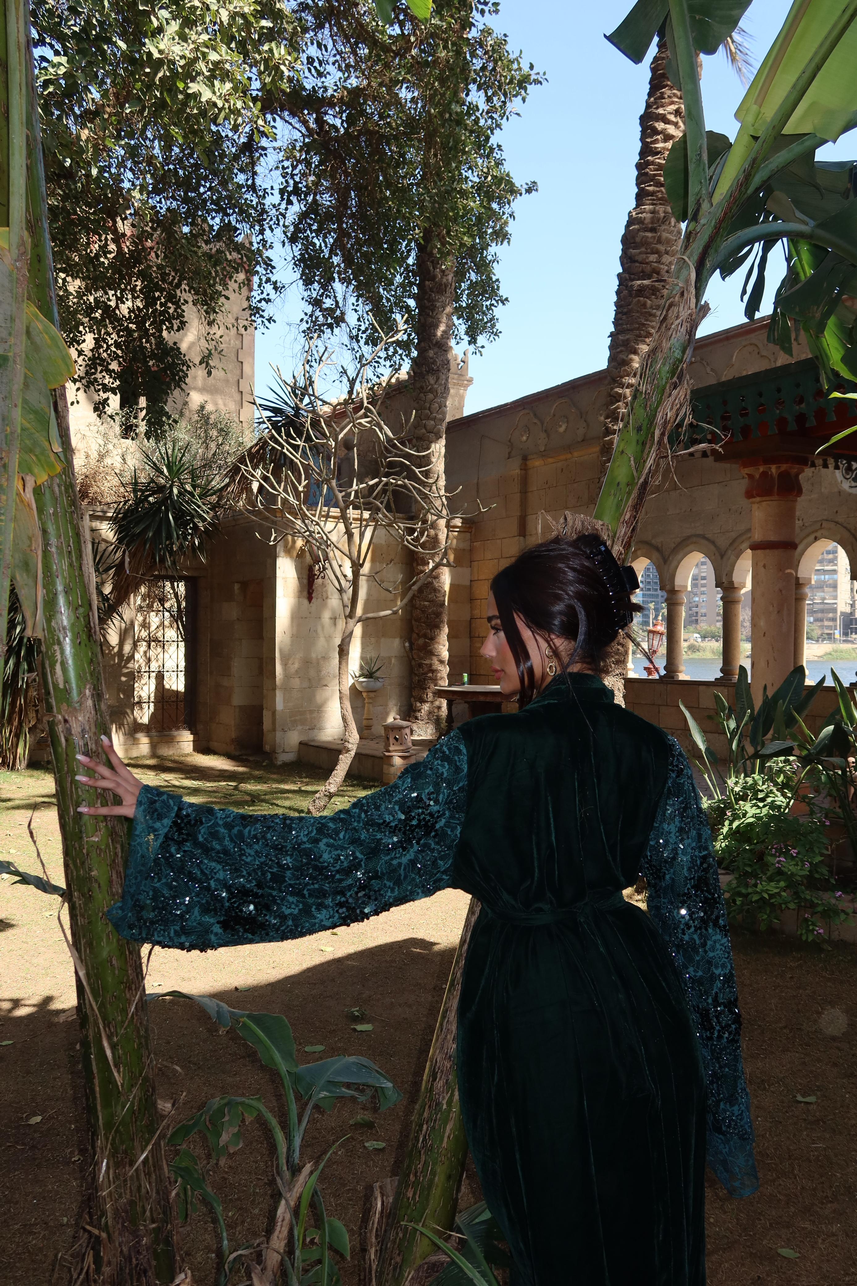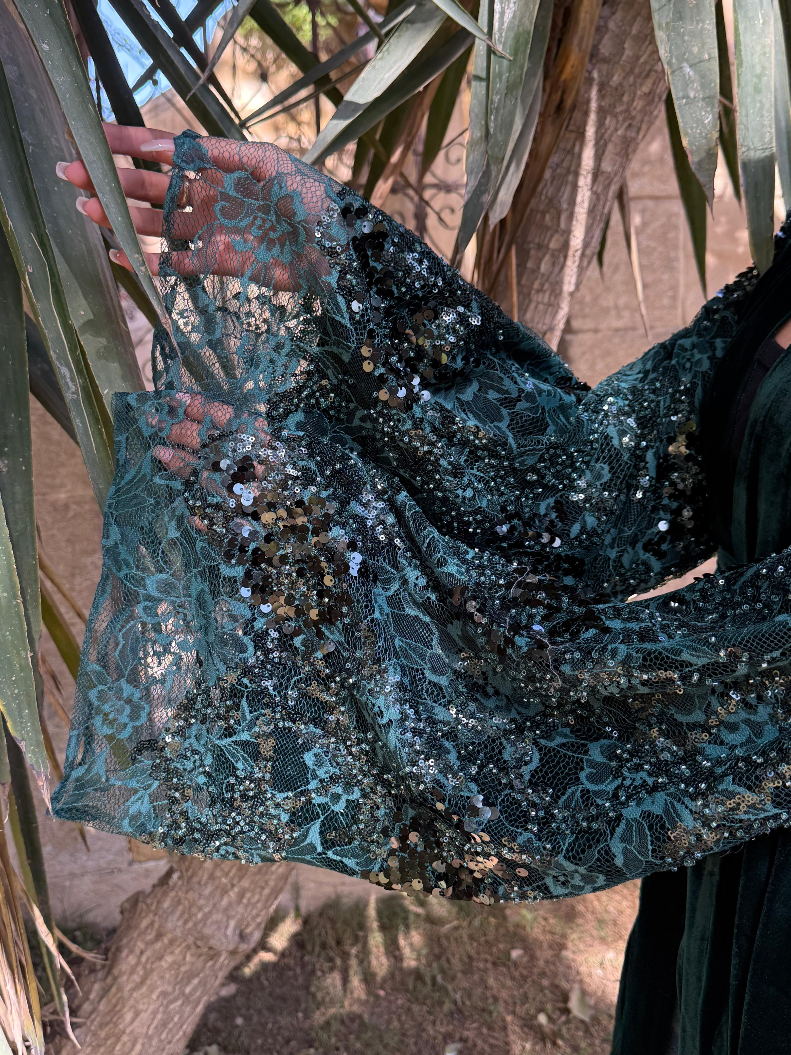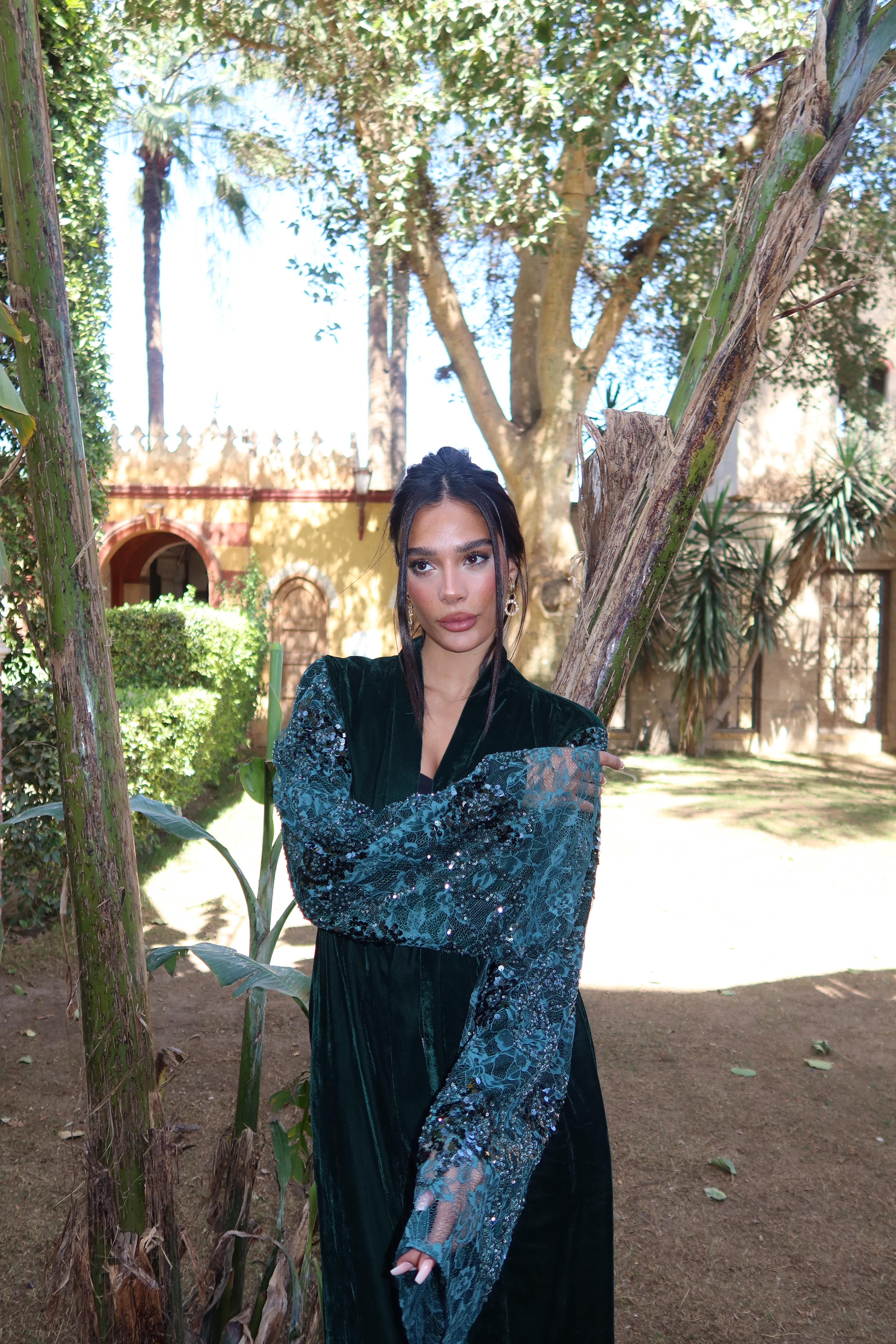 Emerald velvet kaftan paired with sequined lace sleeves, blending rich texture with delicate shimmer.